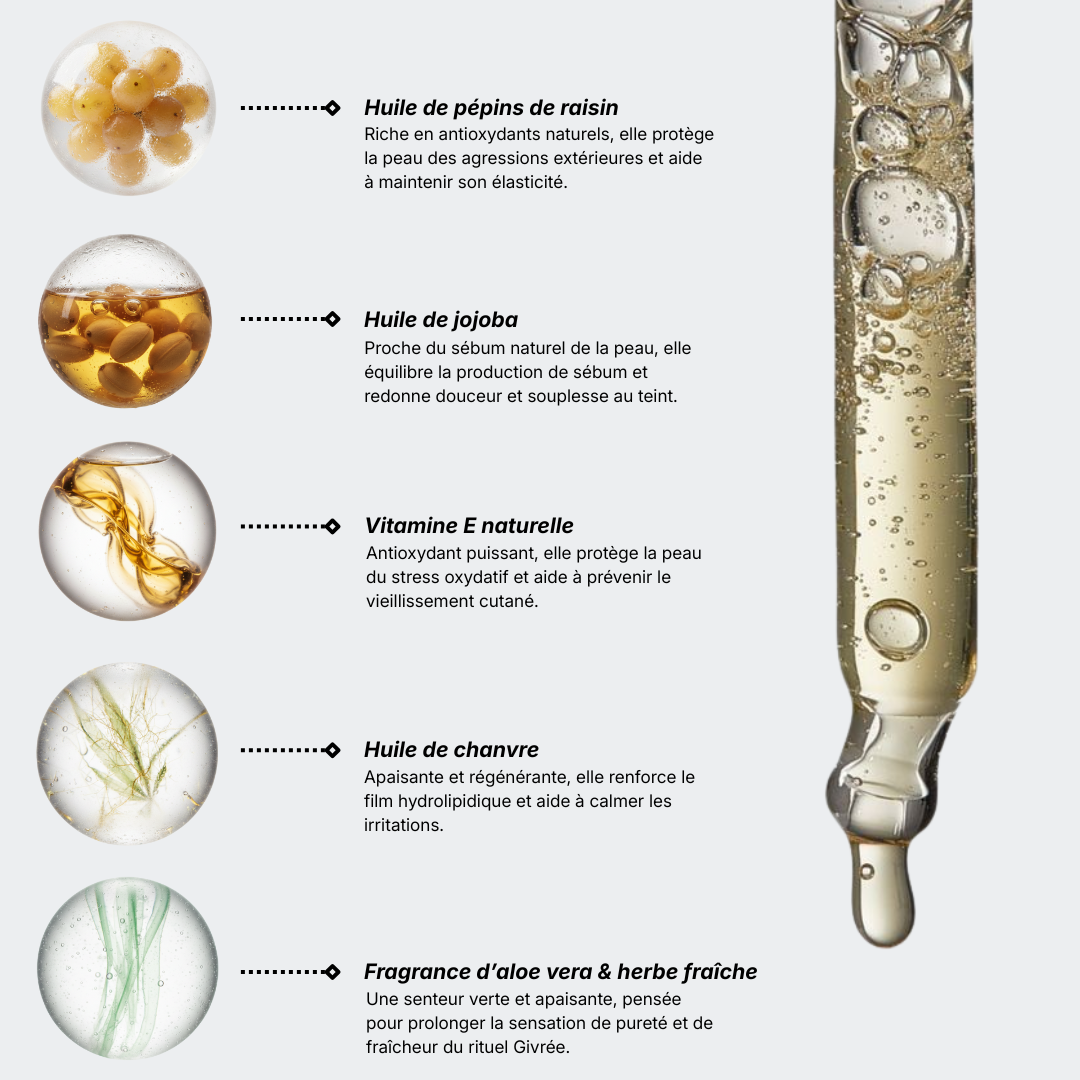- Huile de pépins de raisin - Huile de chanvre - Huile de jojoba - Vitamine E - Parfum